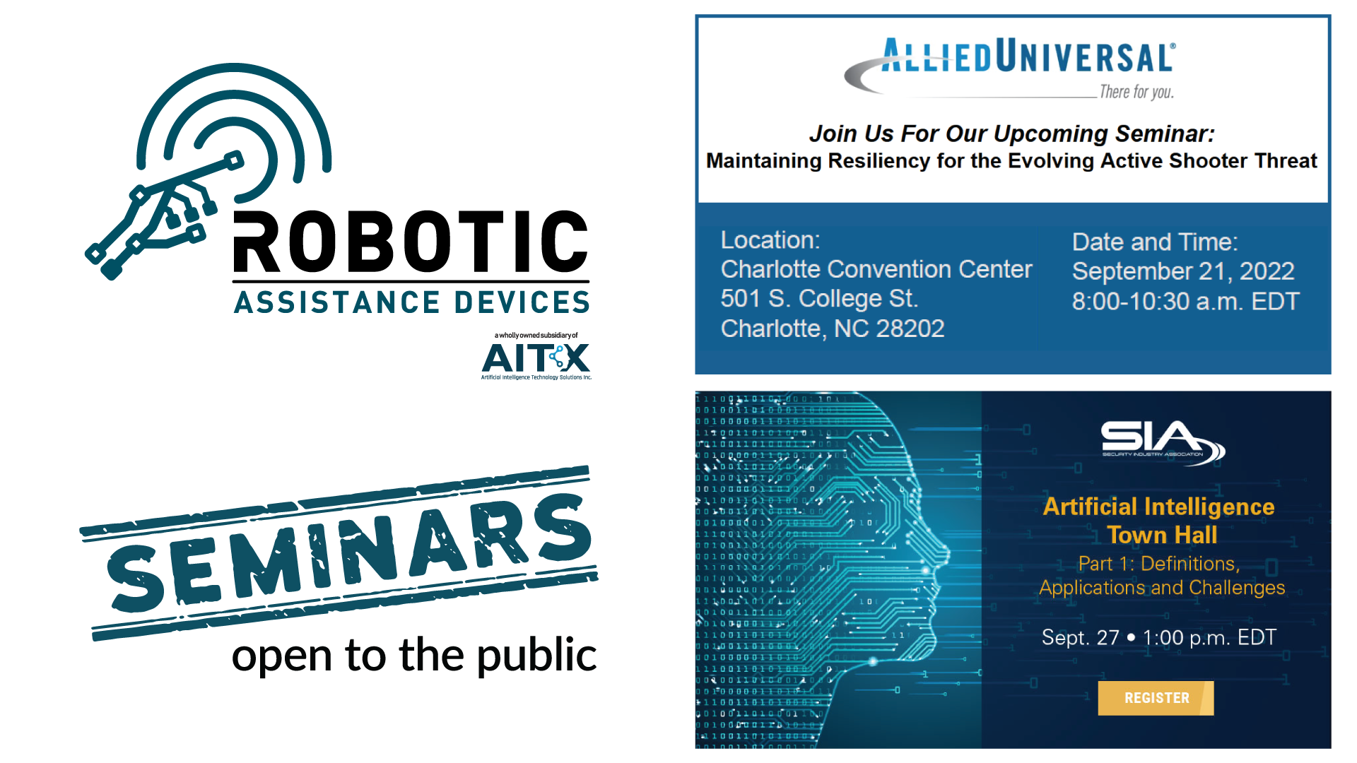 Detroit, Michigan, Sept. 08, 2022 (GLOBE NEWSWIRE) -- Artificial Intelligence Technology Solutions, Inc., (OTCPK:AITX), today announced that its wholly owned subsidiary, Robotic Assistance Devices, Inc. (RAD) will be participating and presenting at two security industry seminars.
