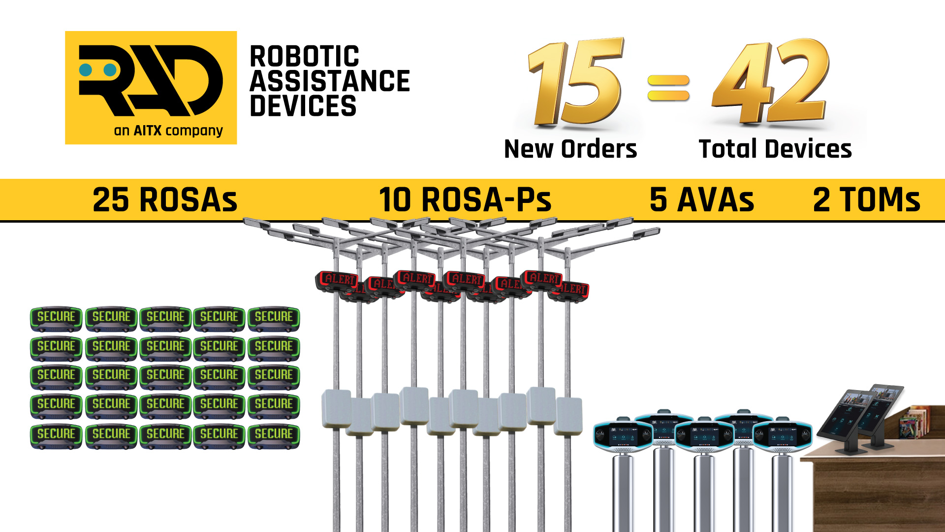 The configuration of the 42 RAD devices placed on order is 25 ROSA stationary robots, 10 ROSA-P, switched-powered, pole-mounted solutions, 5 AVA access control devices, and 2 TOM autonomous visitor management solutions.