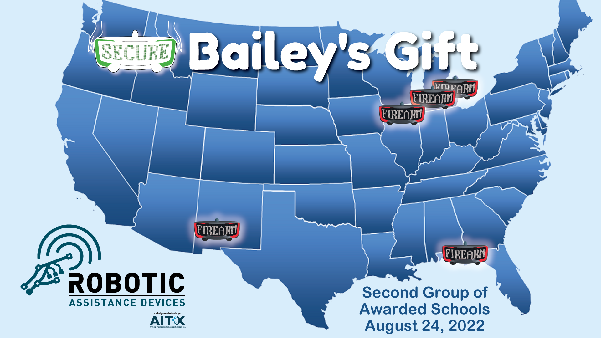 Detroit, Michigan, Aug. 24, 2022 (GLOBE NEWSWIRE) -- Artificial Intelligence Technology Solutions, Inc., (OTCPK:AITX), along with its wholly owned subsidiary Robotic Assistance Devices, Inc. (RAD) today announced the selection of the second group of recipients of its school firearm detection campaign. The program, Bailey’s Gift, is named in memory of Bailey Holt, who was shot and killed by a gunman during the January 23, 2018, Marshall County High School shooting in rural Kentucky.