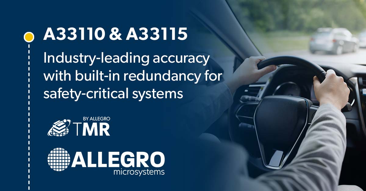 Manchester, NH, June 27, 2022 (GLOBE NEWSWIRE) -- Allegro MicroSystems, Inc. (“Allegro”) (Nasdaq: ALGM), a global leader in sensing and power solutions for motion control and energy-efficient systems, today announced the launch of its A33110 and A33115 magnetic position sensors at the Sensors Converge Conference in San Jose, CA. Designed for advanced driver assistance systems (ADAS) applications that require high levels of accuracy and heterogeneous signal redundancy, Allegro’s newest sensors combine the company’s vertical Hall technology (VHT) with cutting-edge tunneling magnetoresistance (TMR) technology in a single sensor package. These groundbreaking angle sensors are the first of their kind to feature this technology combination in a single package. This VHT + TMR offering is a superior heterogeneous redundant sensor solution and is an essential step toward enabling the reliability required for advanced levels of automation in vehicles.