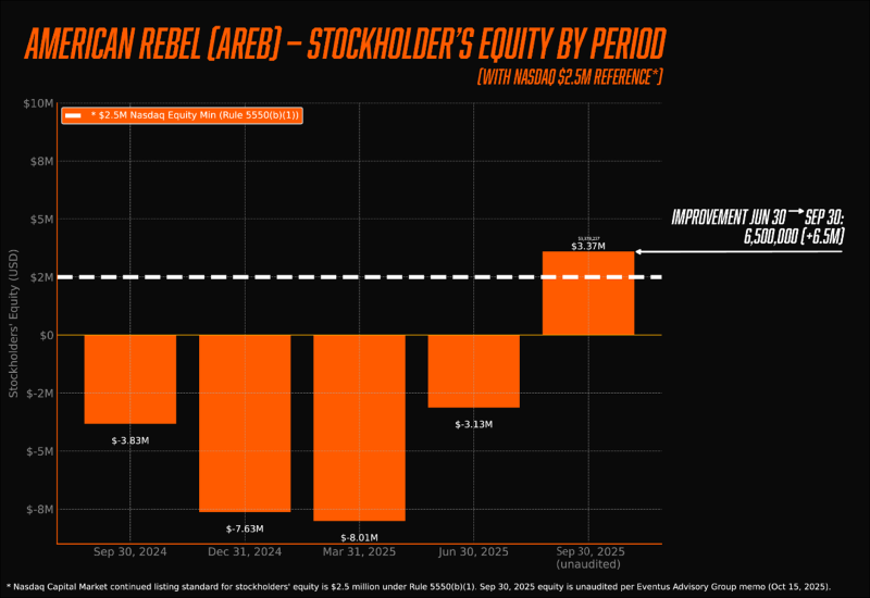 $(8,012,673) as of March 31, 2025, to positive equity of$3,378,257 as of September 30, 2025, an improvement of approximately$11.4 million . The March 31, 2025, deficit was disclosed in the Company’s Q1 2025 Form 10-Q. - American Rebel moved from a stockholders’ deficit of