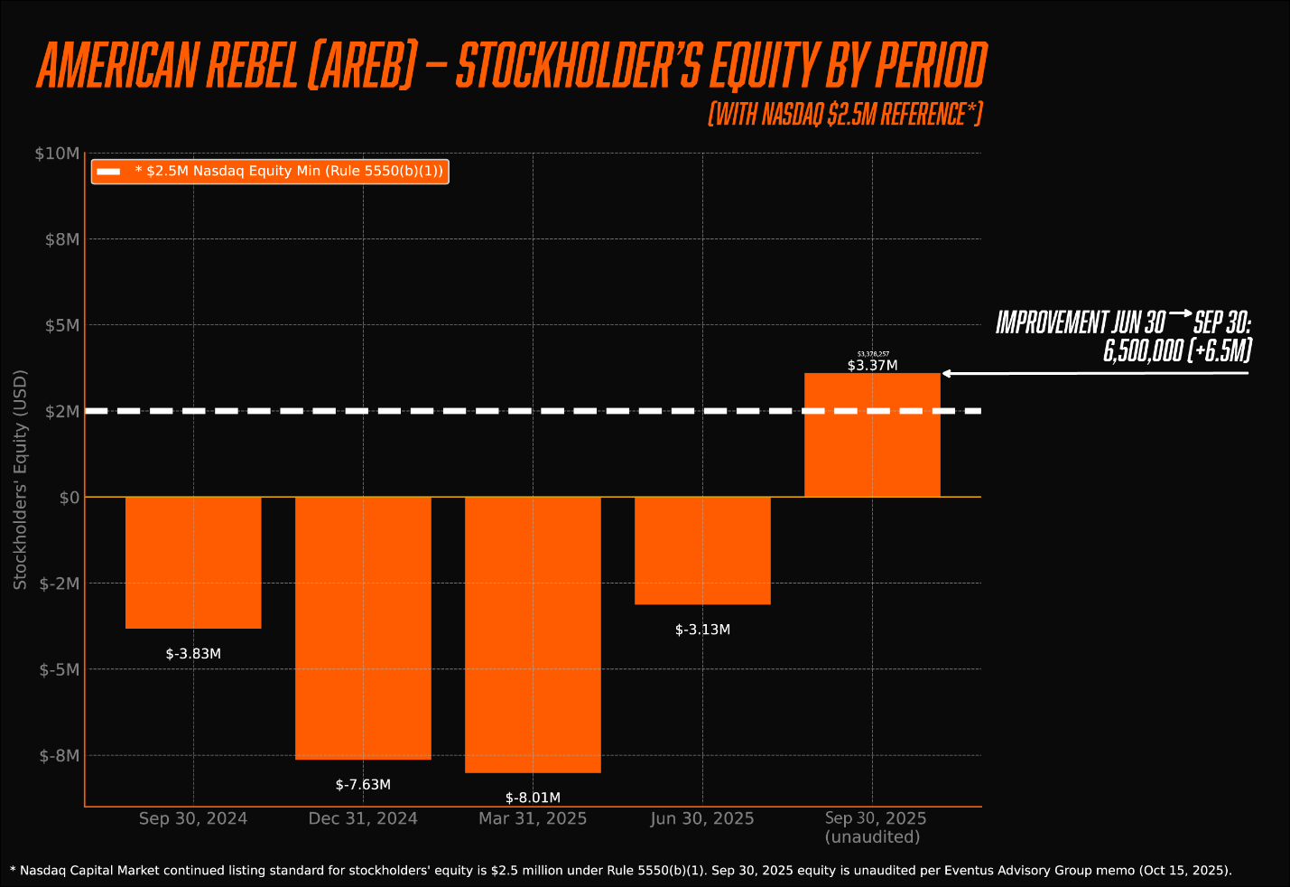 American Rebel moved from a stockholders’ deficit of approximately $(8.0) million on March 31, 2025 to positive stockholders’ equity of $3,378,257 as of September 30, 2025, surpassing the $2.5 million Nasdaq threshold required by Listing Rule 5550(b)(1). The Nasdaq Hearings Panel’s written determination dated November 21, 2025 confirms the Company satisfied the previously granted exception and will remain listed on The Nasdaq Capital Market under the symbol AREB.