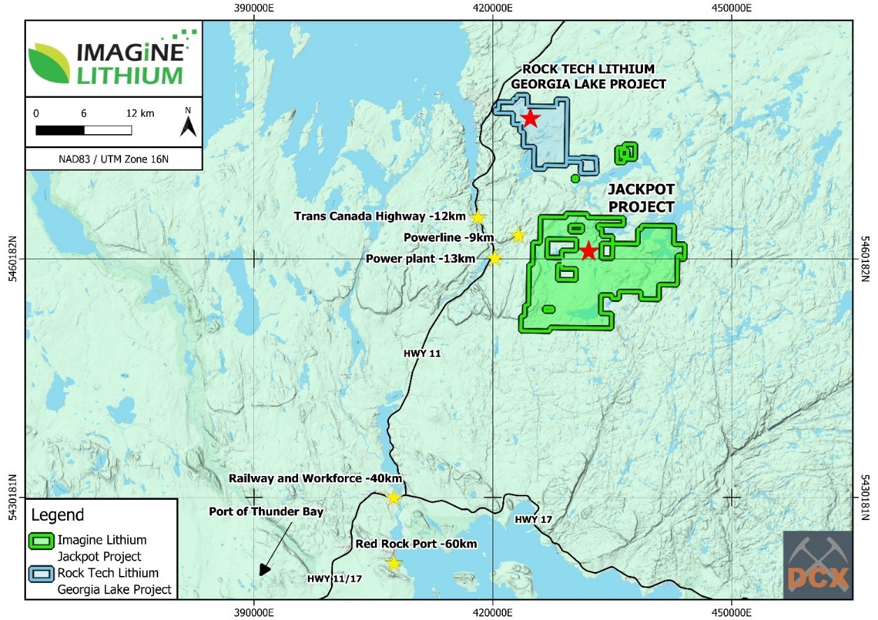 Imagine is a junior mining exploration company focused on seeking and acquiring world-class mineral projects. The company holds the Jackpot lithium property located in the Georgia Lake area about 140 km NNE of Thunder Bay, Ontario, is approximately 12 km by road from the Trans-Canada Highway (Hwy 11), and is in proximity to sources of power, railroads, and ports. The Jackpot Property consists of 297 mineral claims covering 18,800 hectares. The Property contains NI 43-101 compliant Mineral Resources of 3.1 Mt grading