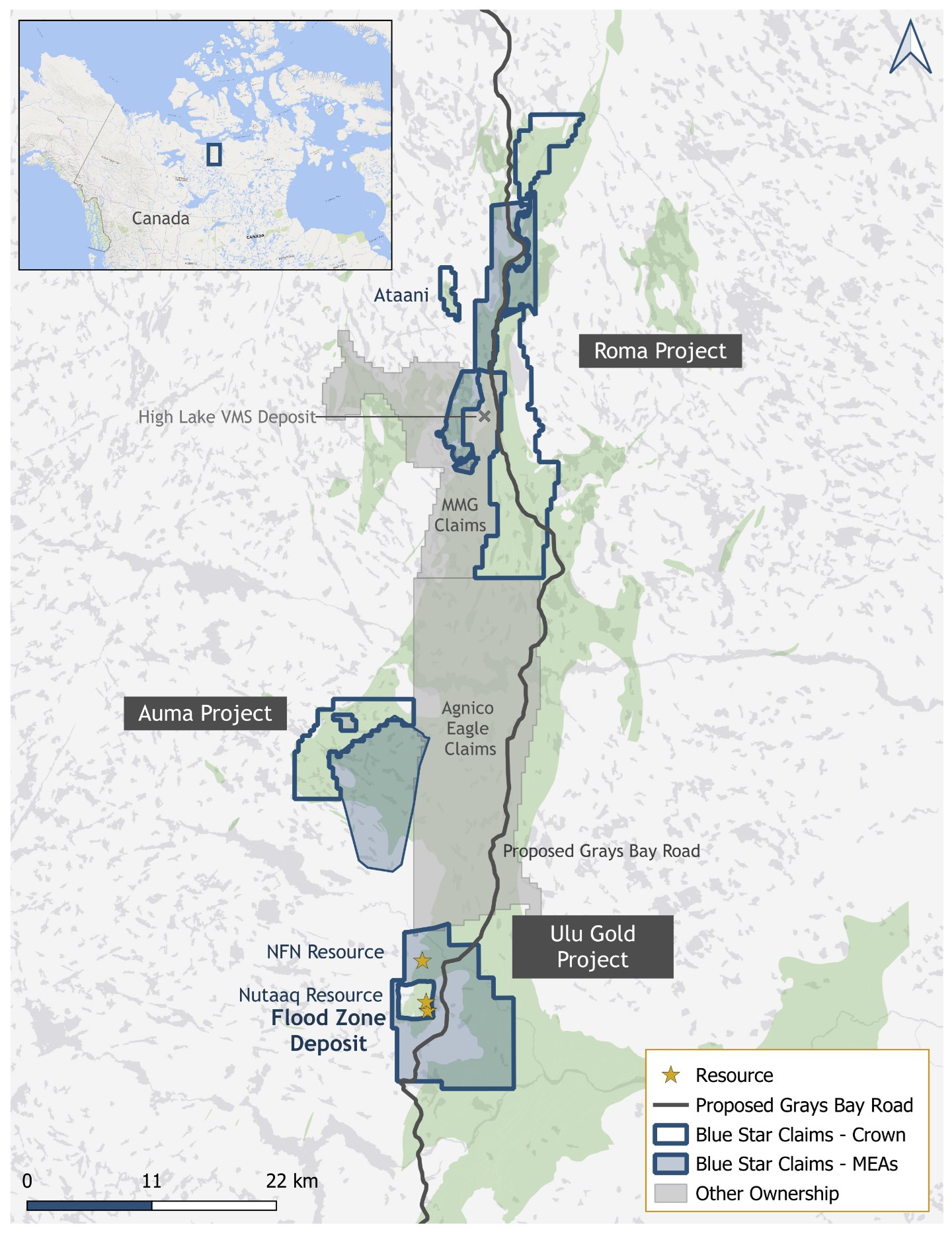 Blue Star Gold Corp. is a mineral exploration and development company focused on Nunavut, Canada. The Company controls over 420 square kilometres of highly prospective and underexplored mineral properties in the High Lake Greenstone Belt. Its principal assets include the Ulu Gold Project - comprised of the Ulu Mining Lease and Hood River Property, and the Roma and Auma Projects. The Ulu Mining Lease hosts the high-grade Flood Zone Gold Deposit, and the Company's broader land package contains numerous high-priority gold and critical mineral targets, providing substantial upside potential for resource expansion. Blue Star's projects are strategically located 40-100 km south of the proposed Grays Bay deep-water port, with the planned all-weather Grays Bay Road corridor passing near both the Roma and Ulu Gold Projects.