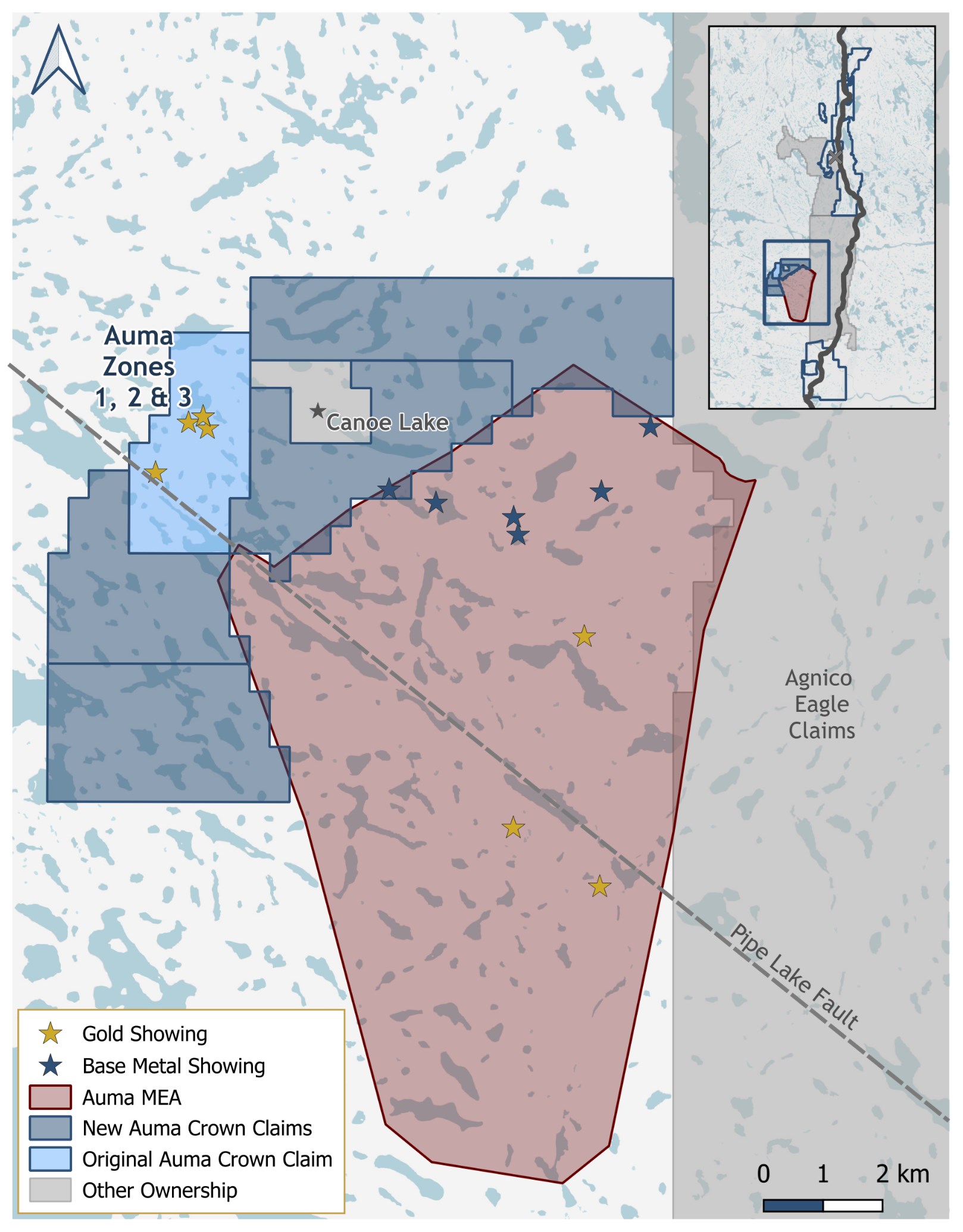 The expanded Auma Property includes approximately 4,255 hectares of Crown mineral claims and 7,539 hectares subject to a Mineral Exploration Agreement on Inuit Owned Land. The land package captures a favourable stratigraphic sequence considered prospective for both orogenic gold and volcanogenic massive sulphide ("VMS") mineralization.