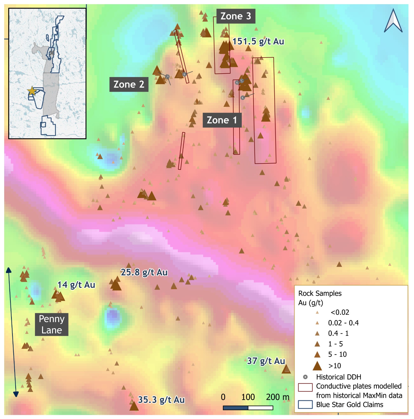 - Zone 3, which hosts the highest-grade surface gold samples on the property and has never been drill tested, targeting a coincident EM and magnetic anomaly interpreted to potentially reflect pyrrhotite-rich vein selvages observed at surface