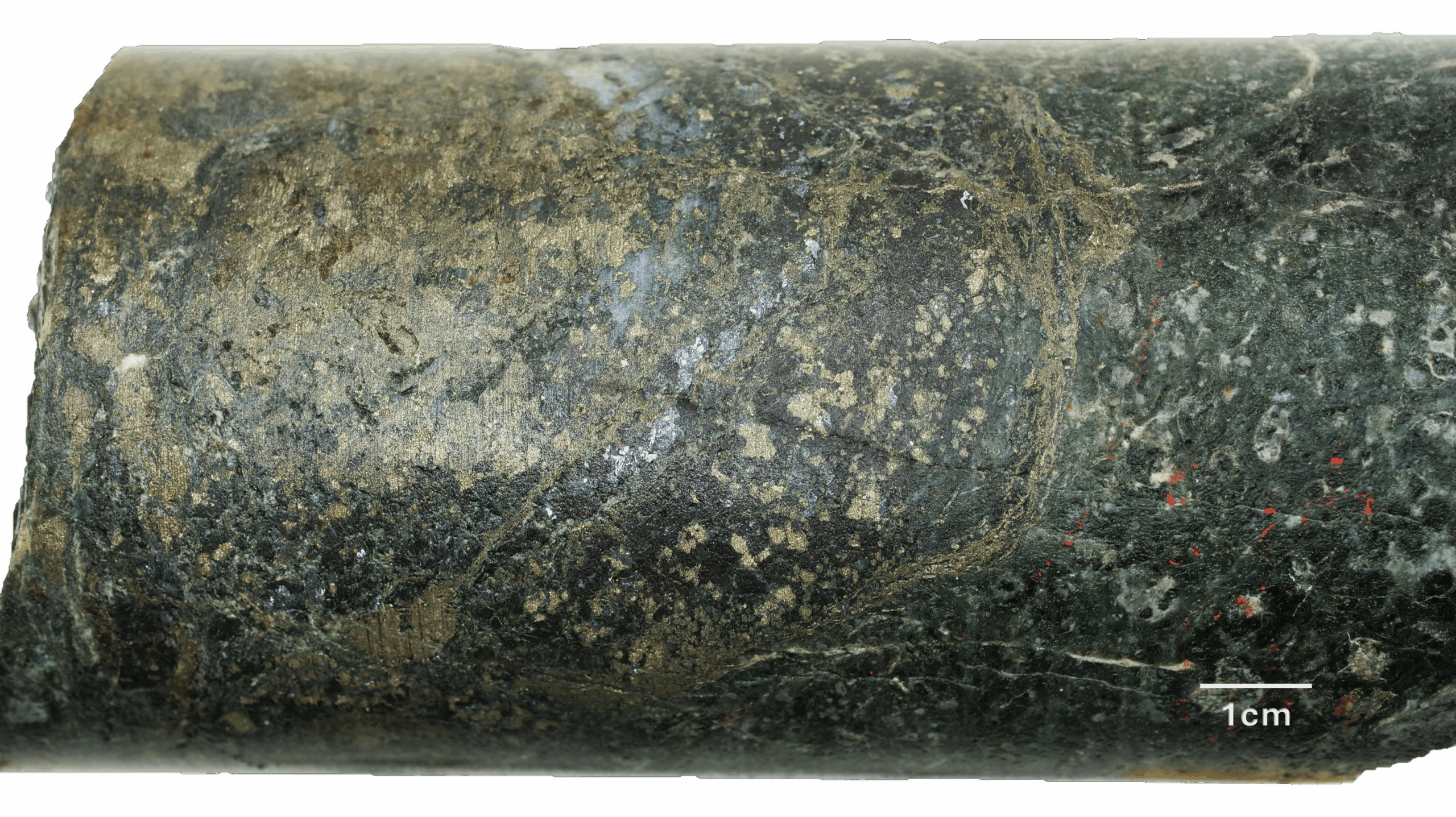 The gold mineralization in THN25-344 is hosted within Triassic lapilli tuff, intruded by a Cretaceous quartz diorite and a feldspar porphyry dike of unknown age. Gold is associated with vein assemblages of pyrite-sphalerite-galena as seen in Figures 2 and 3. While mineralization is hosted within all three rock types, higher grade favours the contacts between these units. Low grade gold mineralization occurs between these reported intervals.
