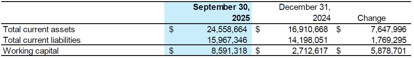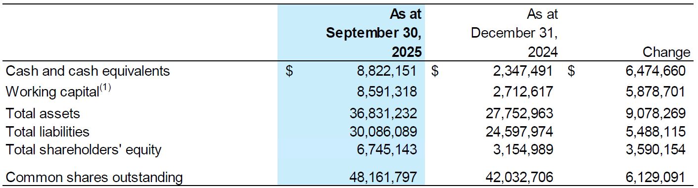 The following table summarizes the Company's financial position at September 30, 2025 and December 31, 2024.