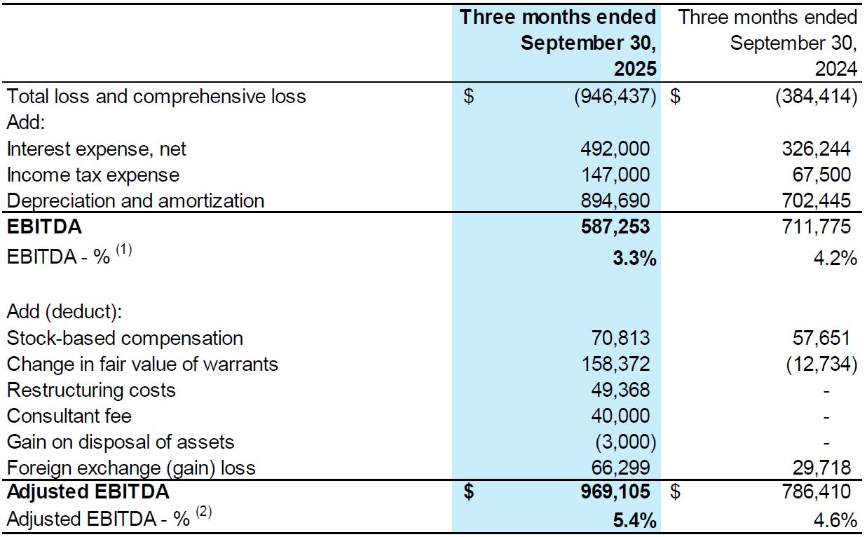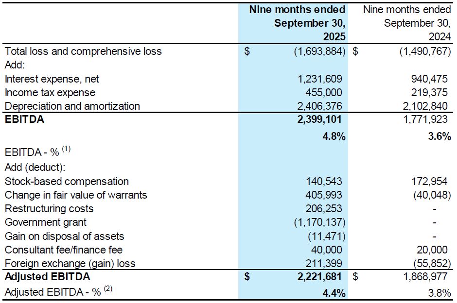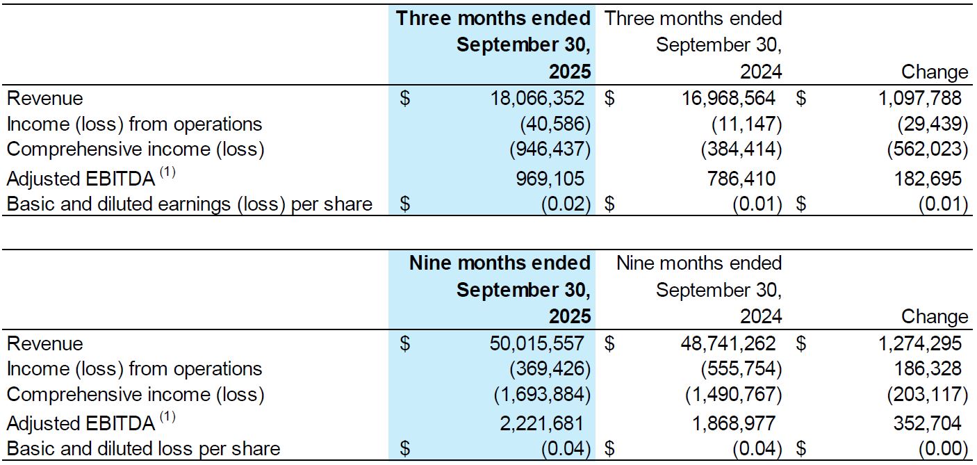 $0.97M in adjusted EBITDA in Q3 2025, an increase of23.2% from$0.79M in Q3 2024, extending the Company's track record to 15 straight quarters of positive performance. - Working capital increased by