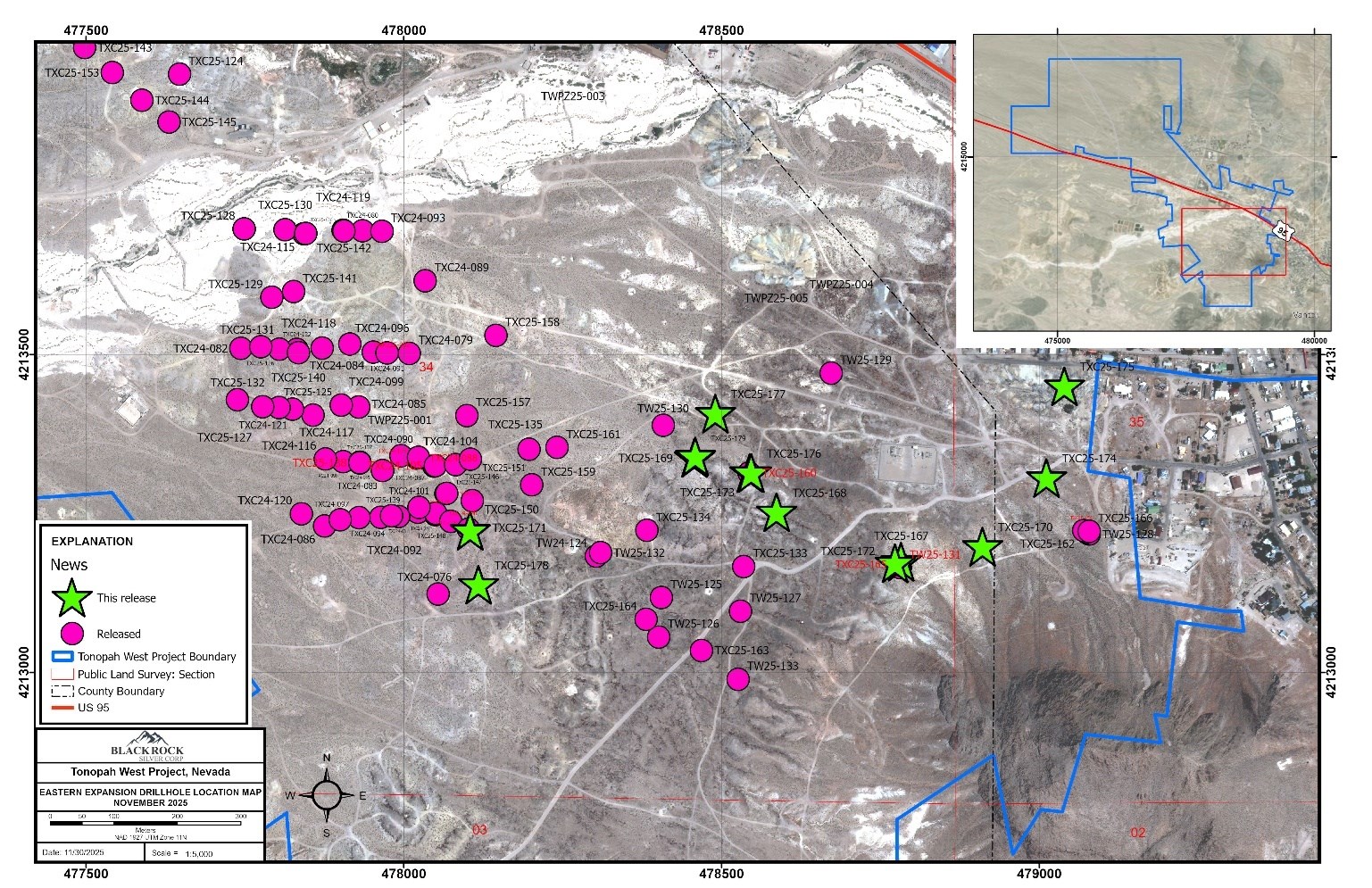 Andrew Pollard, Blackrock's President and CEO, stated, "Whereas we set out to target a single east-west mineralized structure, drilling from our Eastern Expansion Program has defined at least three distinct, parallel mineralized zones oriented northwest. These structures appear to be splays off the Pittsburgh-Monarch fault system. Each of these zones has intersected shallow, high-grade, and thick mineralization, indicating significant potential for further expansion in the area. Additionally, drilling in the M&I Conversion Area at DPB South has successfully connected previously isolated intercepts, confirming the presence of north-south trending structures and suggesting additional tonnage potential. Work on our upcoming mineral resource estimate and preliminary economic assessment is now underway and on track for a targeted completion date in February 2026. These will incorporate data from both our Northwest and Eastern Expansion drill programs."