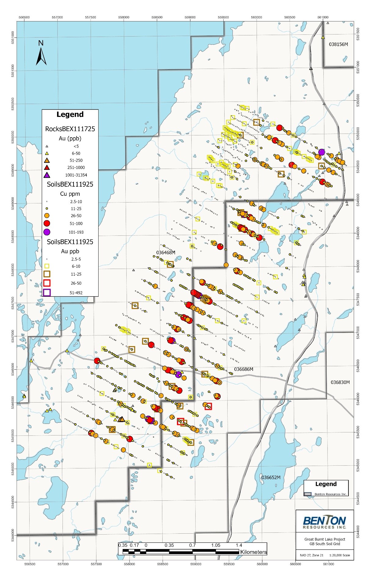 Benton is pleased to report that it has received results for 1,259 soil samples covering a 5.4 x 2 km grid area of the southern 12 km portion of the Great Burnt ("GB") project, where little historical work has been completed (Figure 3). Additionally, a large (2.5 km) multi-line copper anomaly has been delineated which shows similar characteristics to that of the GB main copper deposit. The Company is planning an airborne geophysical survey to cover this untested horizon in order to assist in targeting for future trenching and drilling.