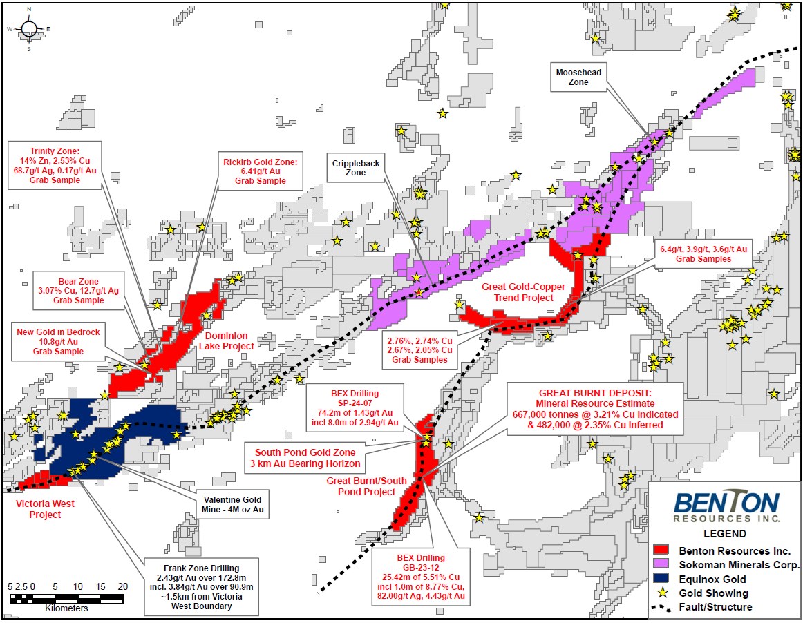 The SCP complements Benton's Great Burnt, Dominion, and Victoria West Projects which all have excellent geology and mineral endowment potential that are proximal to gold and Volcanic Massive Sulphide (VMS) deposits.