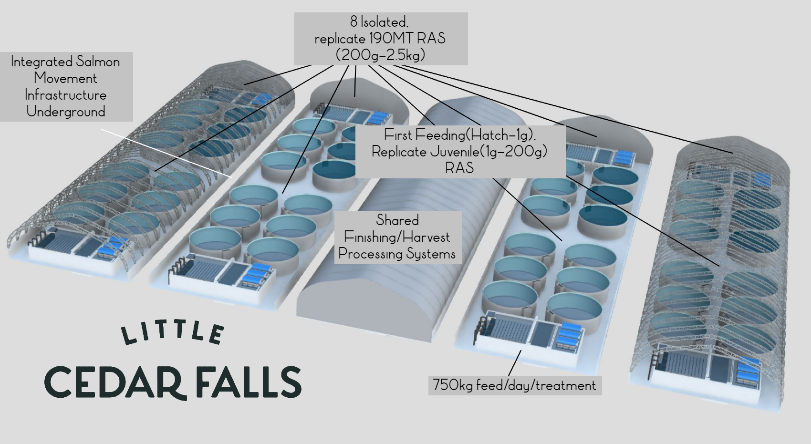 The new RAS modules are each expected to produce 187.5 Tonnes of Steelhead annually, with a single farm consisting of eight modules of six tanks each, with two modules per production unit. The production system is designed such that all established and proven operating procedures and protocols are directly transferrable to the new facilities. Taste of BC will continue to use Fluidized Sand Bed technology for biofiltration, and low head and low energy use will also be a hallmark of the new modules. The proposed facilities will also feature on-site, redundant hatcheries, primary processing and waste capture and remediation.