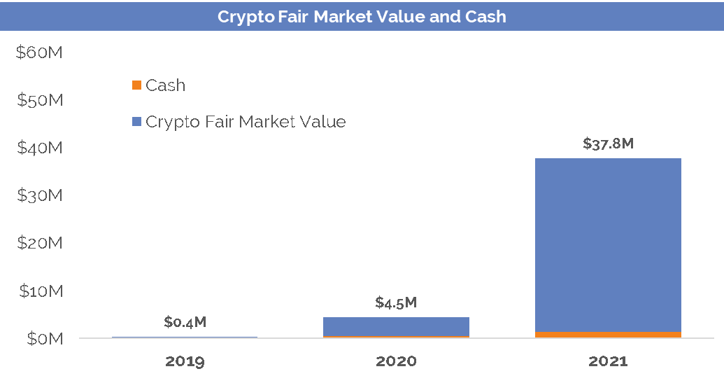 - Cash position of $3.56 per share and digital asset holdings valued positively.