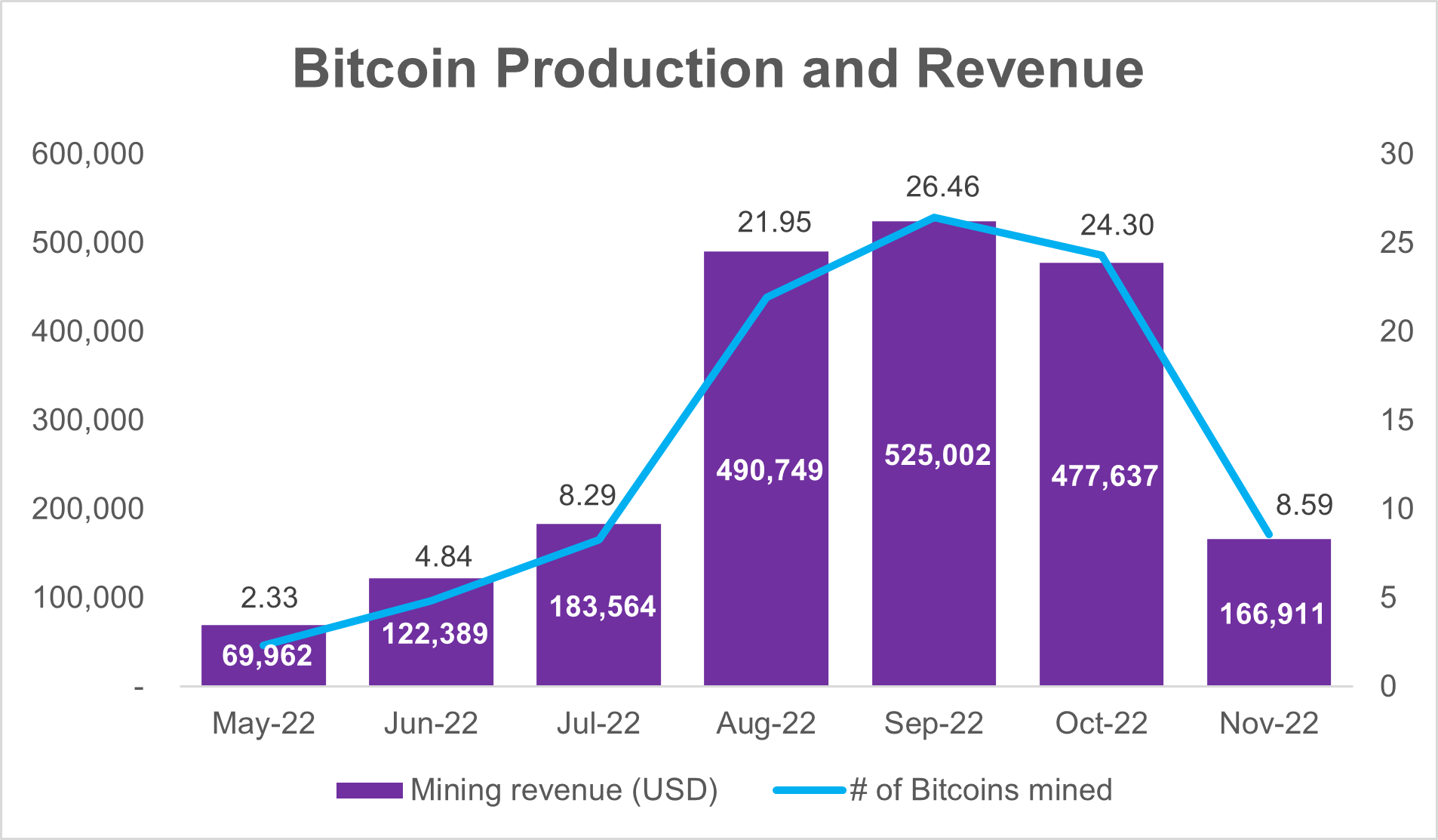 The Company mined 8.59 Bitcoins and achieved a revenue of US