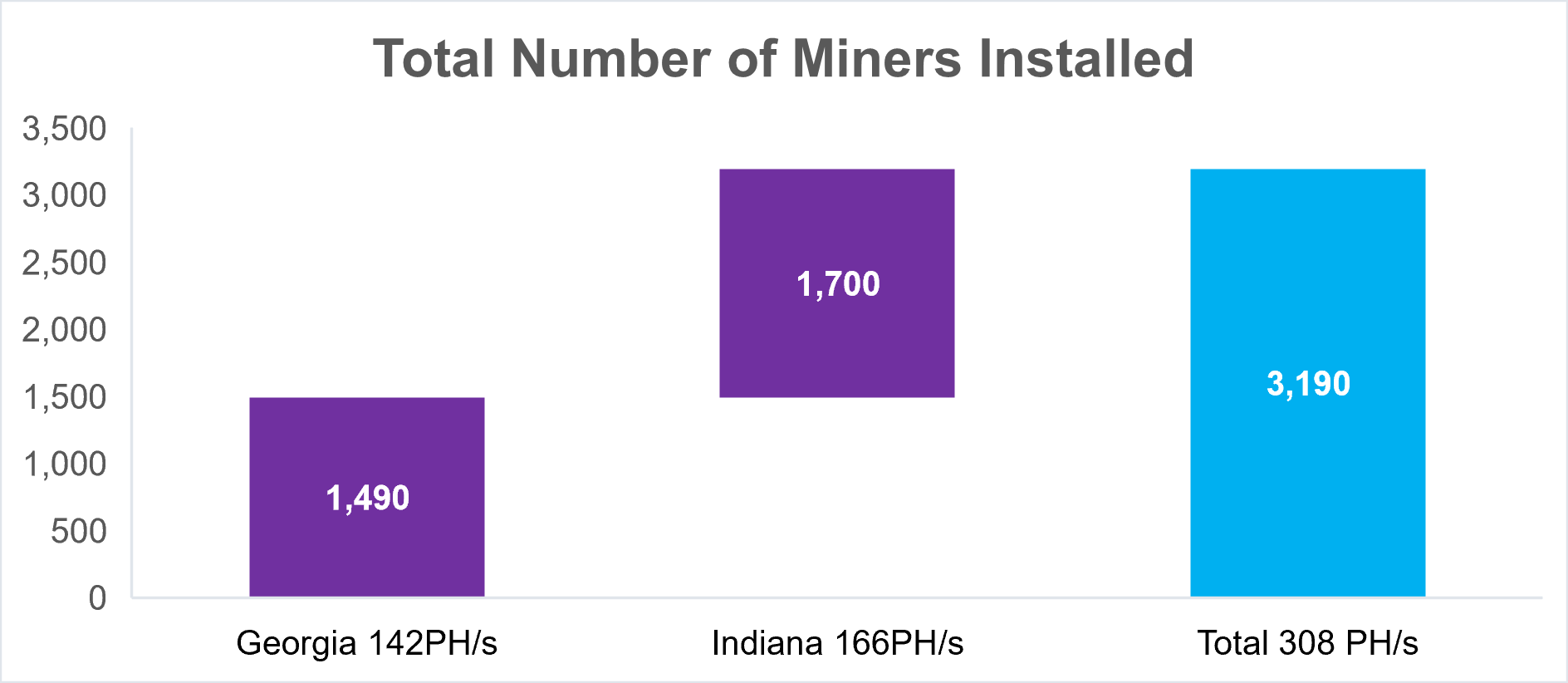 Bit Origin started bitcoin mining in mining sites in Georgia and Indiana in May and June 2022, respectively. As of November 30, 2022, the total mining hash rate remains at 308 PH/s with 3,190 miners installed.