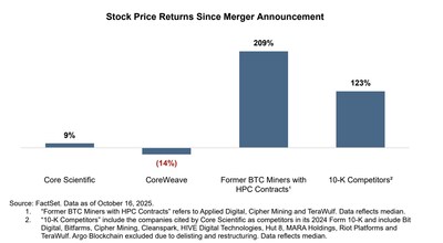 The unprecedented investment in the AI infrastructure build-out has led to a surge in the equity values of HPC data center companies. The stock prices of each of Core Scientific's three closest peers, Applied Digital, Cipher Mining and TeraWulf – each a former Bitcoin miner with HPC contracts – have approximately tripled since the announcement of the Company's proposed sale to CoreWeave, and nearly quadrupled since rumors of the proposed sale first emerged in June 2025.2