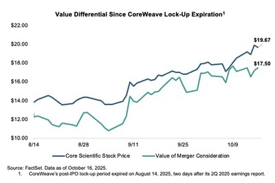 6 Core Scientific's stock price has closed higher than the daily implied value of the merger consideration (based on CoreWeave's closing stock price and the merger exchange ratio) since August 14, 2025, by an average of