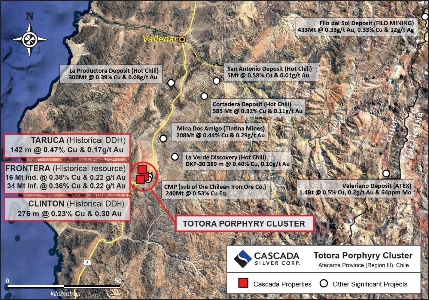 Cascada Silver Corp (OTCQB: CSSCF) hat unverbindliche Absichtserklärungen (MOUs) zum Erwerb von drei fortgeschrittenen Kupfer-Gold-Porphyr-Properti es in Chile unterzeichnet: Frontera, Clinton und Taruca (Totora-Cluster), etwa 60 km südlich von Vallenar nahe der Autobahn HWY 5 und Hochspannungsleitungen.