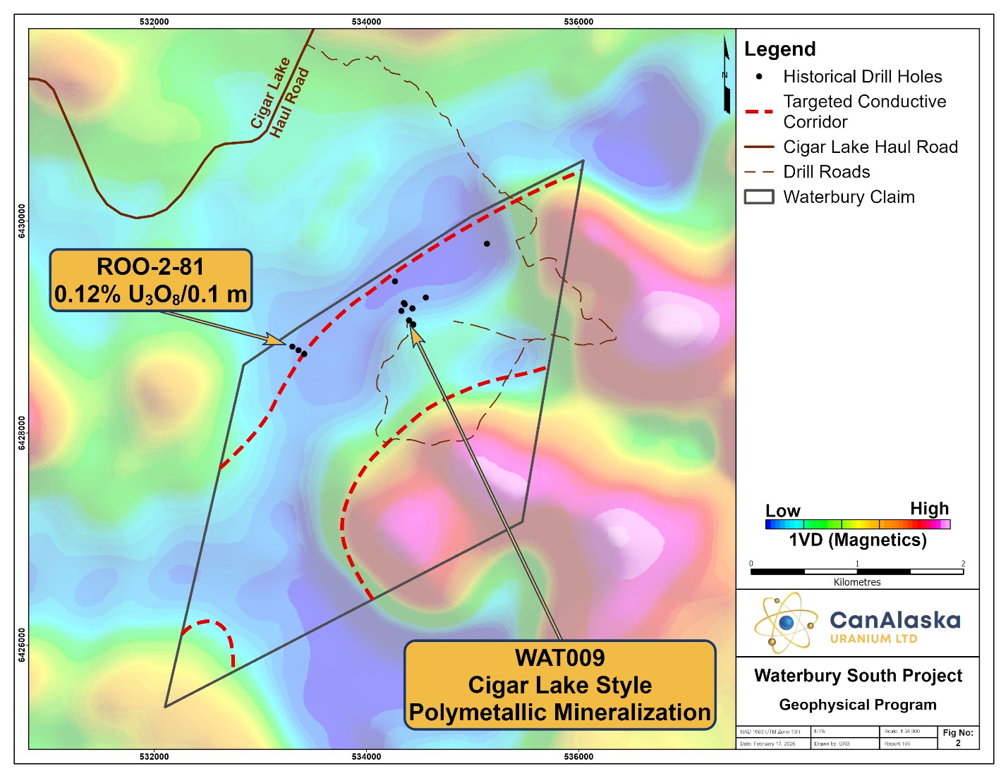 CanAlaska CEO, Cory Belyk, comments, "The Waterbury South project has been sitting in our opportunity list for a few years as we advanced the West McArthur Pike Zone discovery. CanAlaska now has access to lower-cost capital to move this project toward discovery by following up on these very significant results from our recent drill programs in 2021 and 2022. The style and strength of polymetallic mineralization in WAT009 is directly relatable to the style of mineralization encountered at the nearby giant Cigar Lake uranium mine. Further discovery of uranium mineralization on this project has been hampered by not having new geophysical data to support drilling. The CanAlaska team is going to correct this through completion of this work in 2026. With Cigar Lake reaching its natural production life end-point in 2036, now is a great time to advance this project for our shareholders."