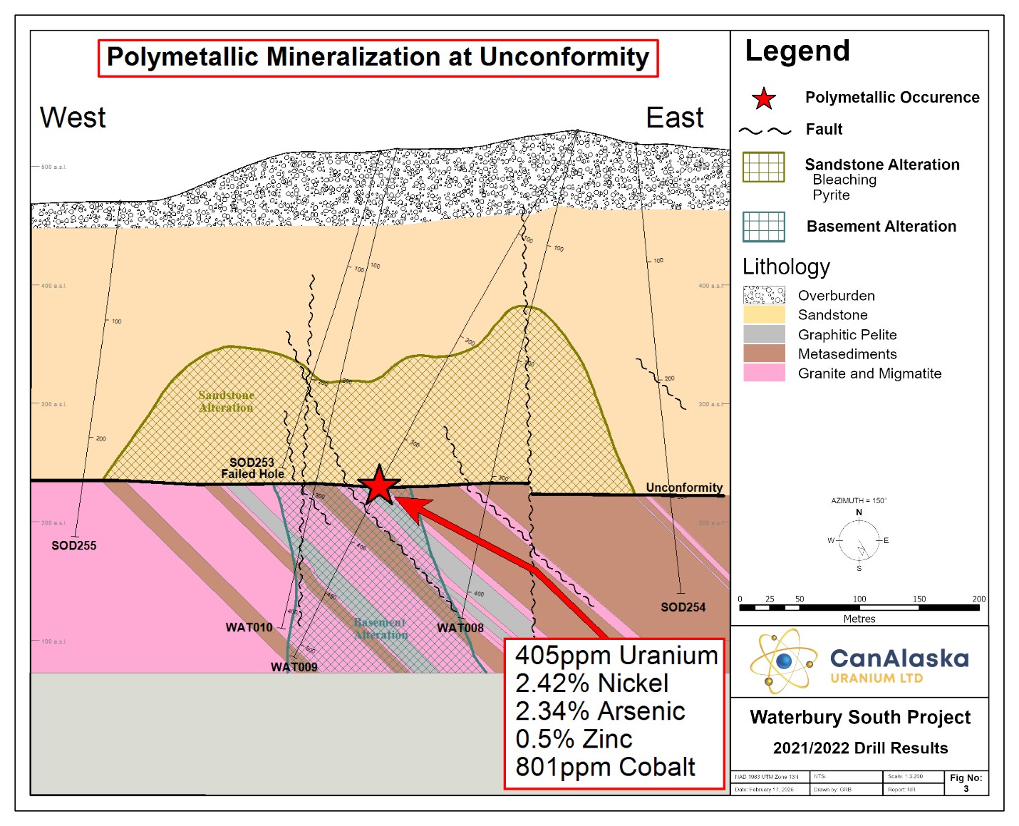 The Company acquired the Project in the mid-2000's and completed an airborne electromagnetic survey followed by a DC Resistivity survey that identified likely sandstone resistivity low breaches, a typical response for post-Athabasca structure and alteration on other projects in the area. In 2021, CanAlaska completed three drillholes on the Waterbury South project. This drill program was highlighted by WAT009 which intersected a strongly altered lower sandstone column with bleaching, sooty pyrite, desilicification, and chlorite, associated with polymetallic mineralization at the unconformity. The polymetallic mineralization is characterized by 0.5 m with 405 ppm uranium,