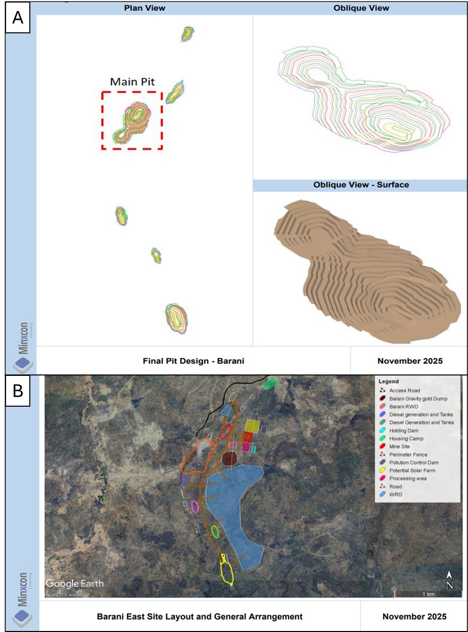 Figure 1. (A) Final Pit Design for Barani; (B) Proposed Site Layout for Infrastructure (Taken from recent PEA published on Jan. 09, 2026).
