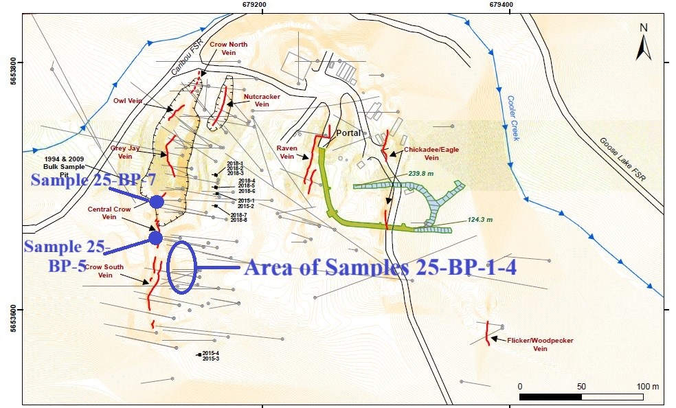 - Grab sample of 1662.2 g/t Au (sample 25-BP-5)