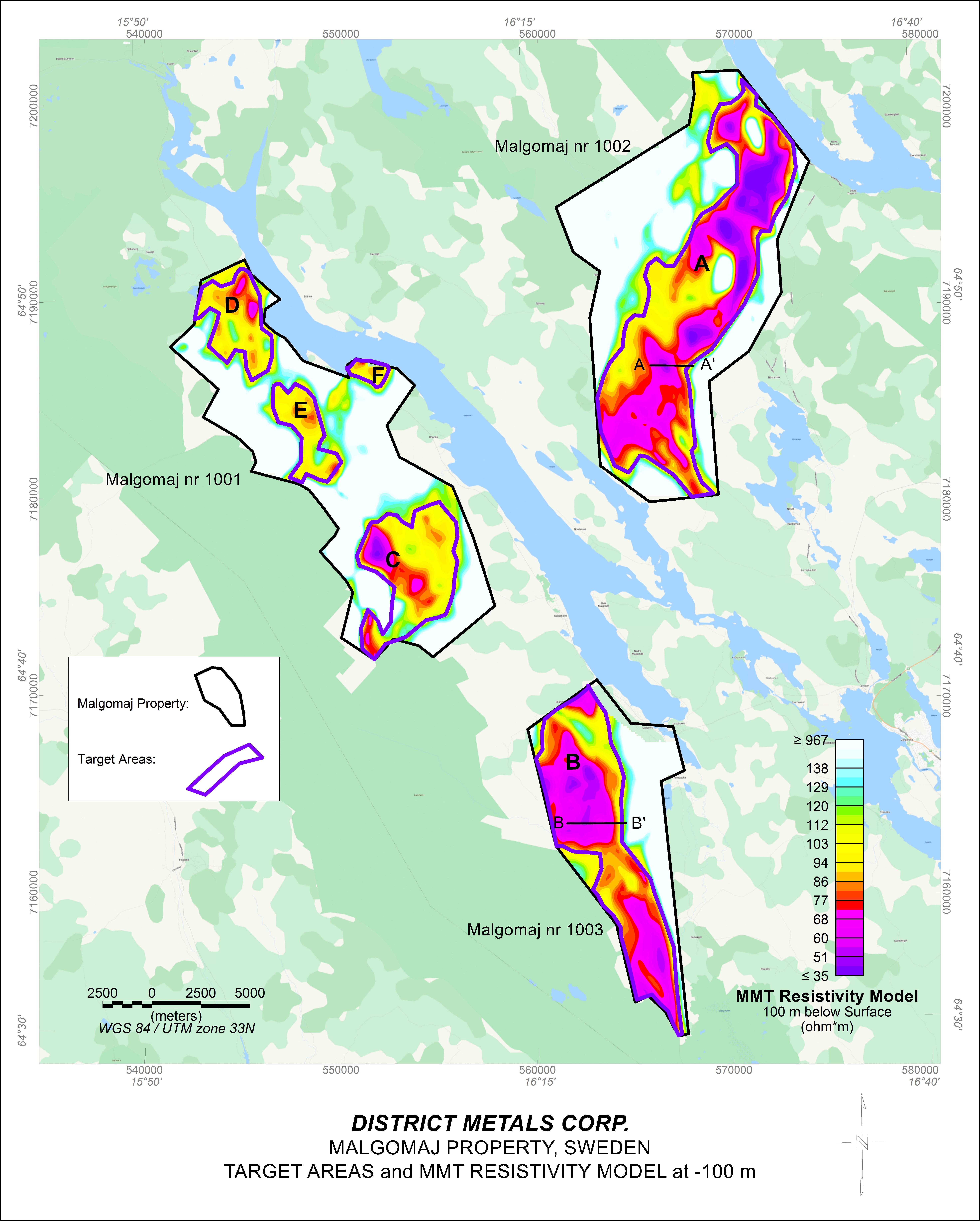 The high resolution MobileMT survey results, covering approximately 37,132 hectares at the Malgomaj mineral licenses nr 1001 to 1003 have successfully outlined six low resistivity (highly conductive) anomalies (Target Areas A to F in Figure 1) consistent with the MobileMT signature observed at the Company's Viken Deposit as reported in District's news release of September 24, 2025. These two target areas show size and scale that surpasses the MobileMT conductive anomalies observed at the Viken Property: