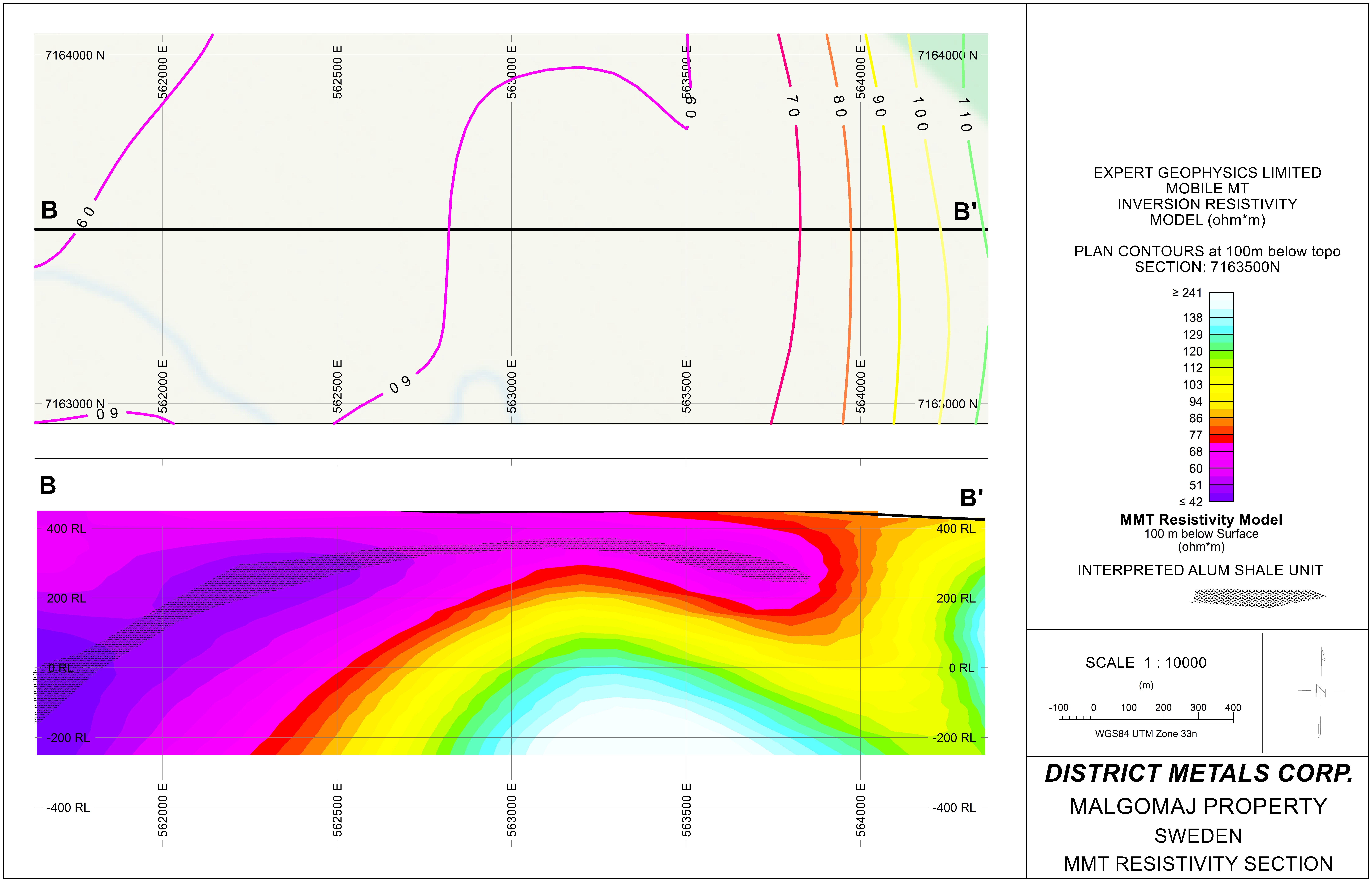 - Target B: 17.7 km long by up to 4.1 km wide low resistivity (highly conductive) anomaly that is interpreted to be Alum Shale.