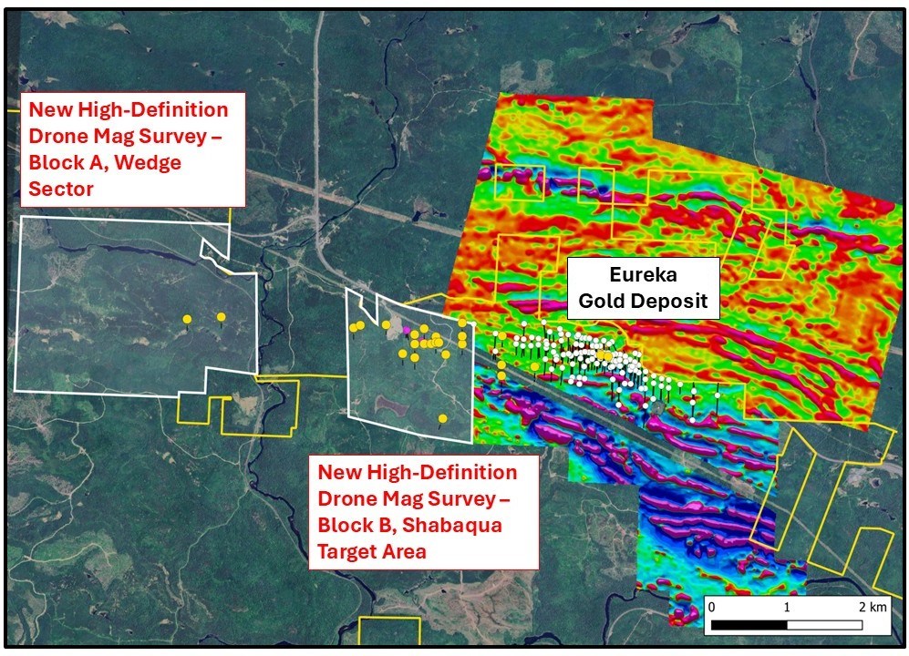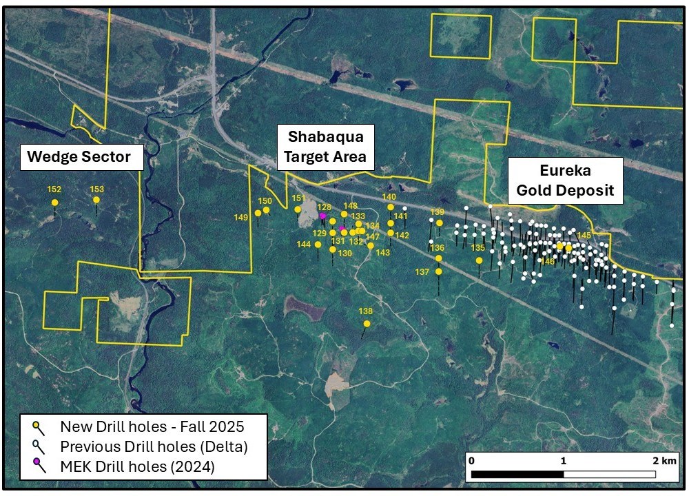 The final two holes targeted the Wedge sector, 5 kilometres west of the Eureka gold deposit and previously undrilled by Delta. Drilling followed 2025 surface mapping, sampling and IP surveys. Delta also completed a high-resolution drone magnetic survey to refine targets ahead of follow-up drilling in the Shabaqua area and Wedge sector. Assay dispatch experienced brief delays; assay results will be reported after QA/QC.