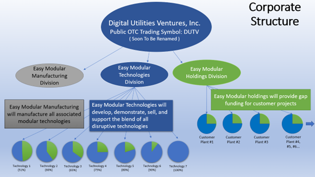 Boston, Massachusetts, May 04, 2022 (GLOBE NEWSWIRE) -- Digital Utilities Ventures, Inc. (OTC Pink: DUTV) is pleasure to announces the following planned Company Structure: