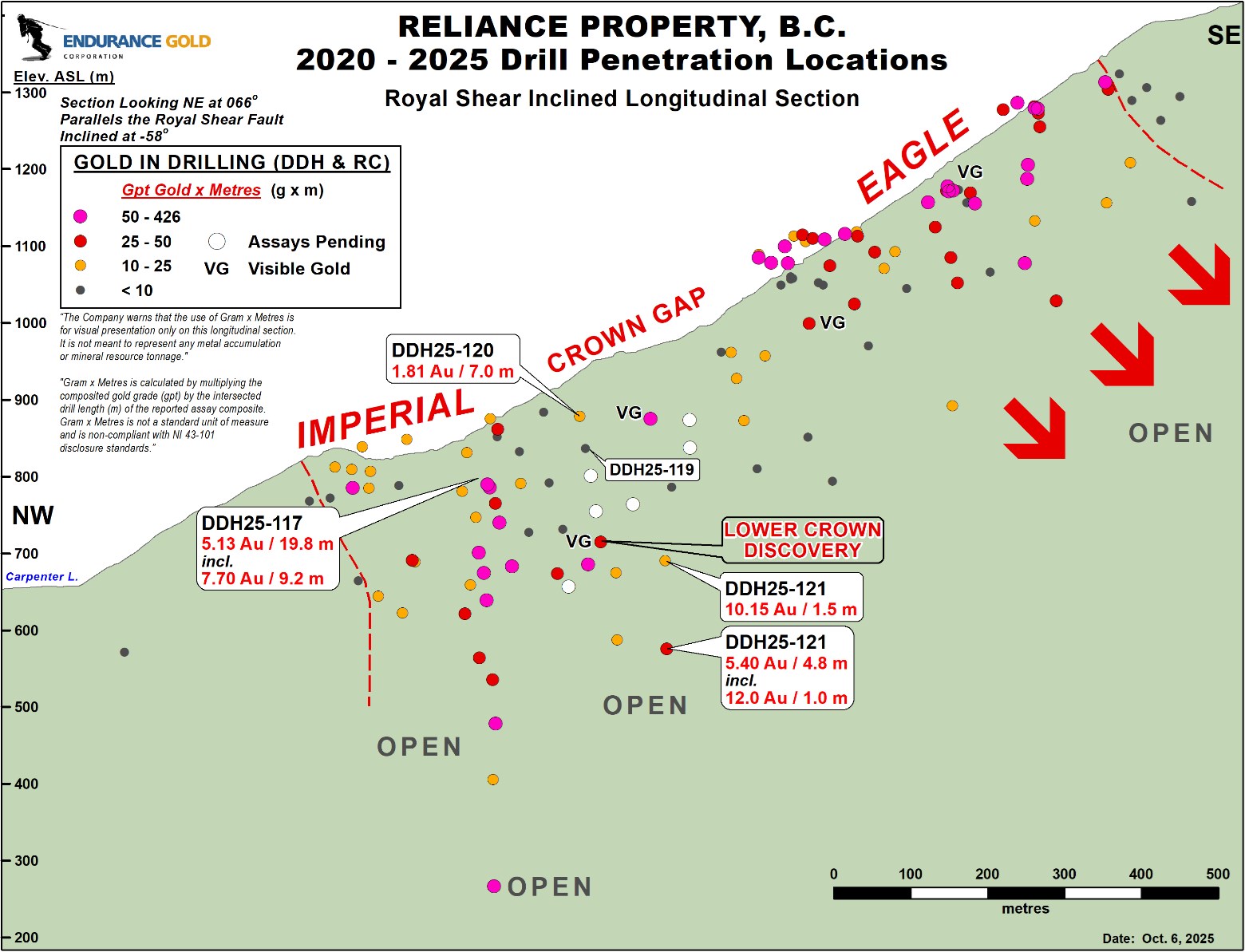 Endurance Gold (OTCQB: ENDGF) ha pubblicato gli assay di quattro fori di perforazione presso il Progetto Reliance Gold il 6 ottobre 2025. I principali risultati includono DDH25-117: 5,13 gpt Au su 19,8 m (incluso 7,70 gpt Au su 9,2 m) e DDH25-121: 10,15 gpt Au su 1,5 m oltre a 5,40 gpt Au su 4,8 m (incluso 12,0 gpt Au su 1,0 m). Dodici dei 18 fori Crown Gap hanno mostrato mineralizzazione di oro+antimonio. Il programma 2025 ha completato 20 fori per un totale di 6.438 m, con cinque analisi in attesa. I test metallurgici e la modellazione delle risorse sono in corso; gli intervalli evidenziati sono riportati come lunghezze del nucleo e come larghezze vere stimate al 90–100%.