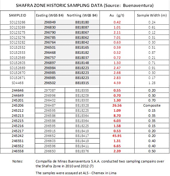 Table 2: Shafra Zone Historic Sampling (Source: Buenaventura)
