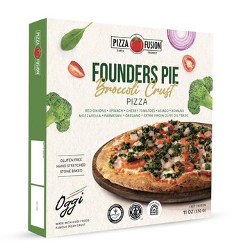 The “Founders Pie” Pizza is topped with our custom made pizza sauce, extra virgin olive oil, Oregano, Basil, real Mozzarella, Romano, Asiago & Parmesan cheeses, imported cherry tomatoes from Italy, diced red onions, fresh spinach on top of OGGI Foods custom gluten-free Broccoli Crust;