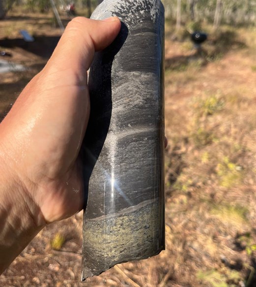 Figure 1 - Sedimentary exhalative style sulphide mineralisation within a carbonaceous mudstone: 191.5m hole WGD25001B