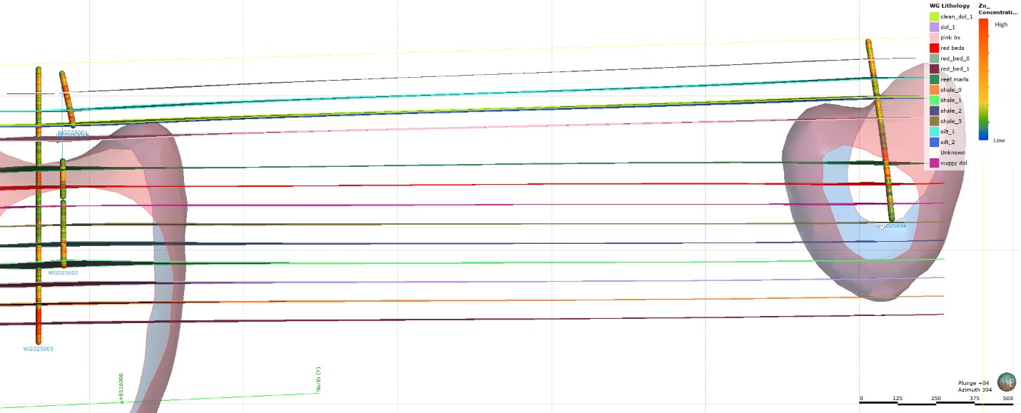 During the program 5 holes were drilled, the deepest hole was drilled to 890.5m. Holes WGD25001A and 1B were abandoned due to poor core recovery. Several zones of dolomitic siltstone and carbonaceous shale enriched in sulphide minerals were encountered.