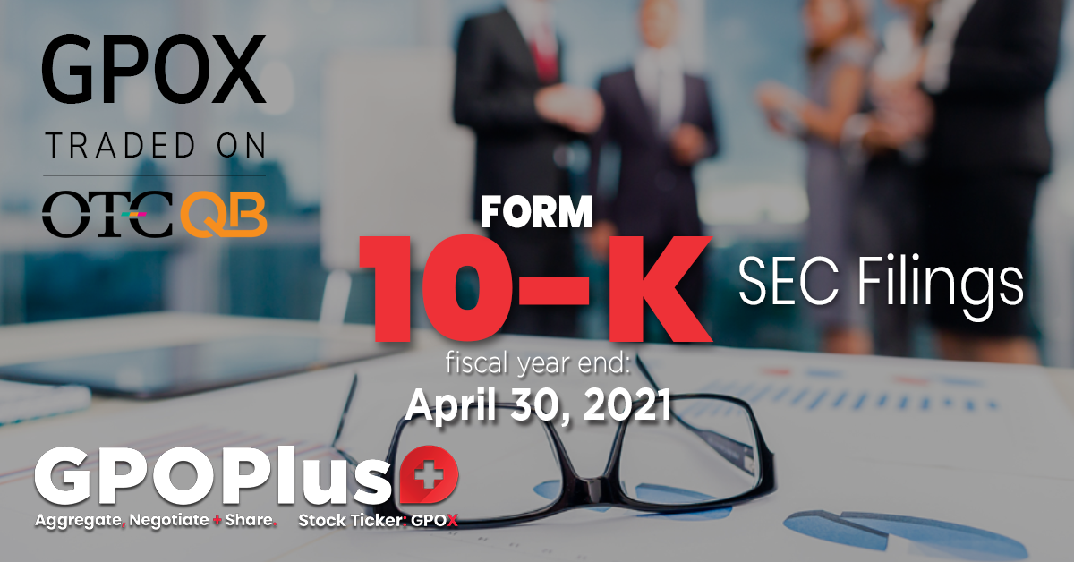 LAS VEGAS, NV, Sept. 13, 2021 (GLOBE NEWSWIRE) -- GPO Plus, Inc. (OTCQB: GPOX), a publicly traded company of diversified industry-specific Group Purchasing Organizations (GPOs), today announced the Company has filed with the Securities and Exchange Commission (“SEC”) its Annual Report on Form 10-K for its fiscal year ended April 30, 2021 (the “2021 Annual Report”) and also announced the launch of its social media content campaign.