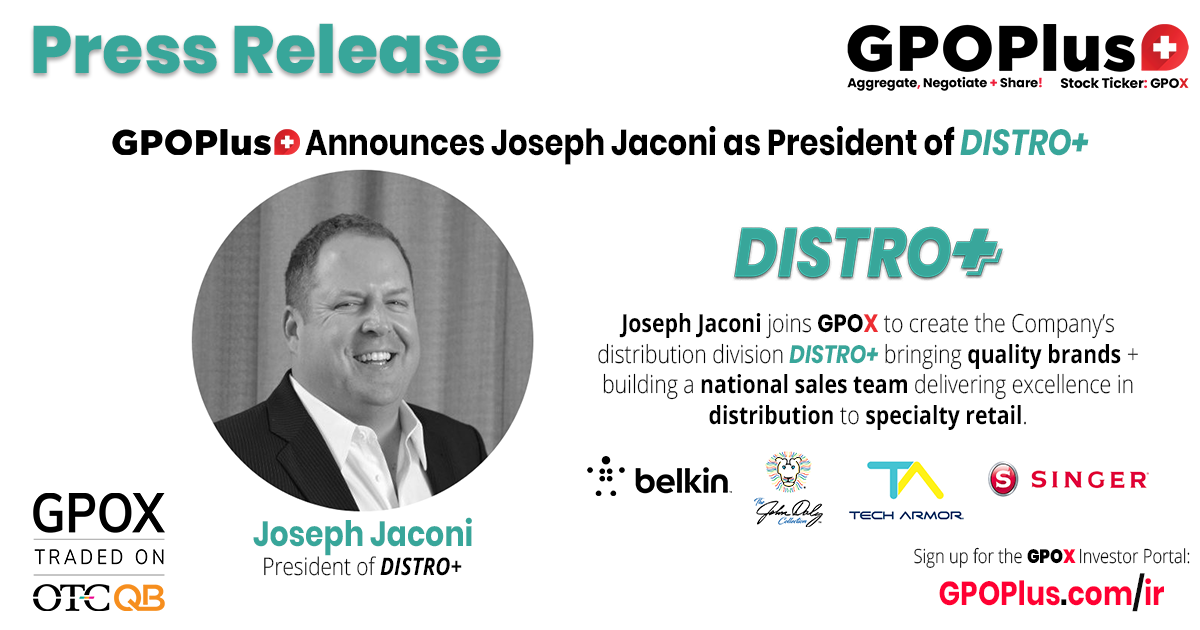 LAS VEGAS, NV, Sept. 21, 2022 (GLOBE NEWSWIRE) -- GPO Plus, Inc. (OTCQB: GPOX), a publicly traded company of diversified Group Purchasing Organizations (GPOs) uses the power of Group Purchasing to save businesses money, announced Joseph Jaconi has been appointed President of DISTRO+, GPOX’s distribution division and GPO for specialty retailers.