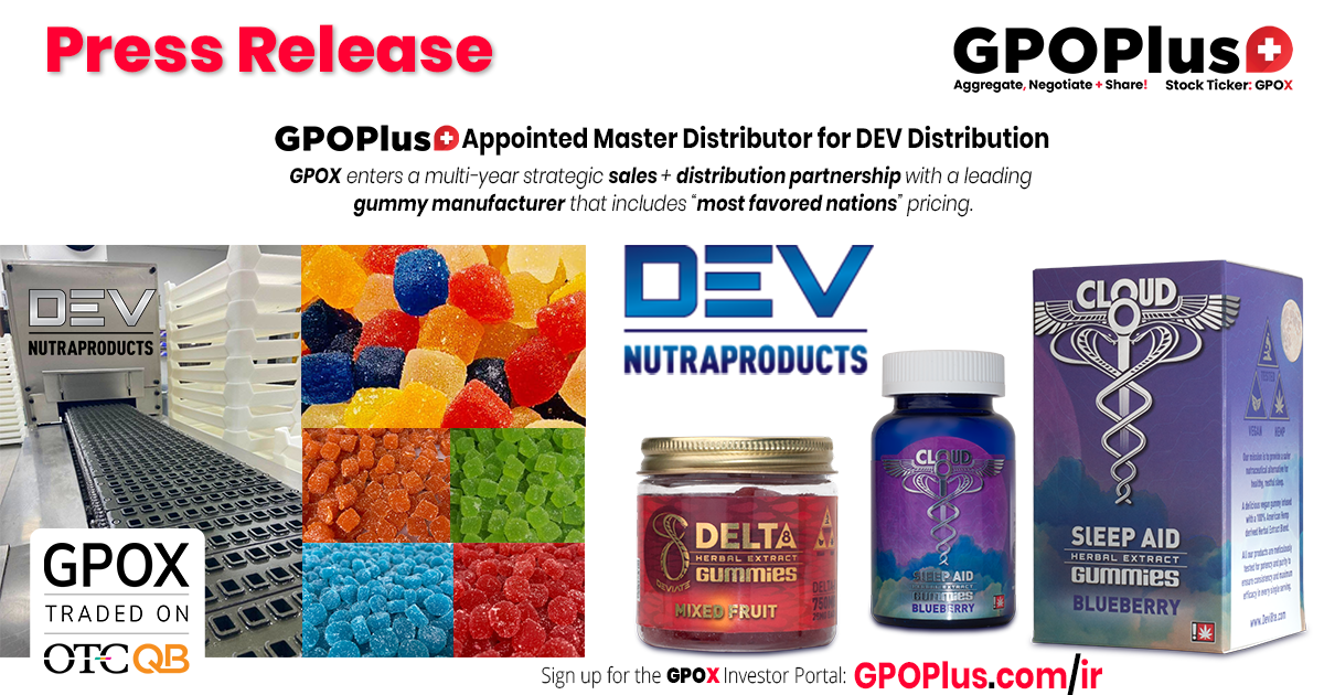 GPOX has entered a strategic multi-year partnership with DEV Distribution as its Master Distributor, effective June 8, 2022. This agreement enables GPOX to distribute DEV's products, including vegan CBD-infused gummies, at Most Favored Nations pricing.