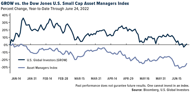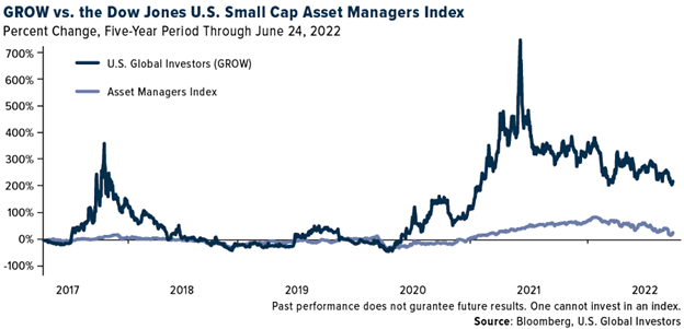 “In a recession, cash is king,” says Frank Holmes, the Company’s CEO and Chief Investment Officer. “We have raised the limit to our share buyback program and increased our dividend twice, and now we are building up our cash position, which we believe is wise and prudent to weather this bear market and what could be a challenging recession. The market has clearly recognized our strategy, as anyone can see in the charts provided. Shares of GROW have managed to outperform an index of asset managers for the shorter year-to-date period and longer five-year period.”