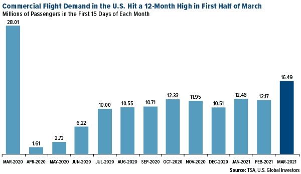 U.S. Global Investors (GROW) announced that its U.S. Global Jets ETF (JETS) has surpassed $4 billion in assets under management (AUM), marking a 2,600% increase year-over-year. JETS also reached a 52-week high of $28.59, up 140% from its pandemic low. Increased trading volume was noted, with average daily trades rising to approximately 6.7 million. Airport screenings indicate a recovery in flight demand, with nearly 1.4 million passengers screened on March 12, 2021. The U.S. vaccination campaign supports continued recovery in air travel and tourism.