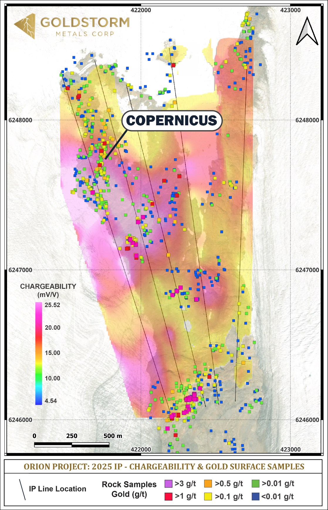 2025 IP Chargeability Map (Gold Samples) - Copernicus Zone at Orion Spine, Crown Property