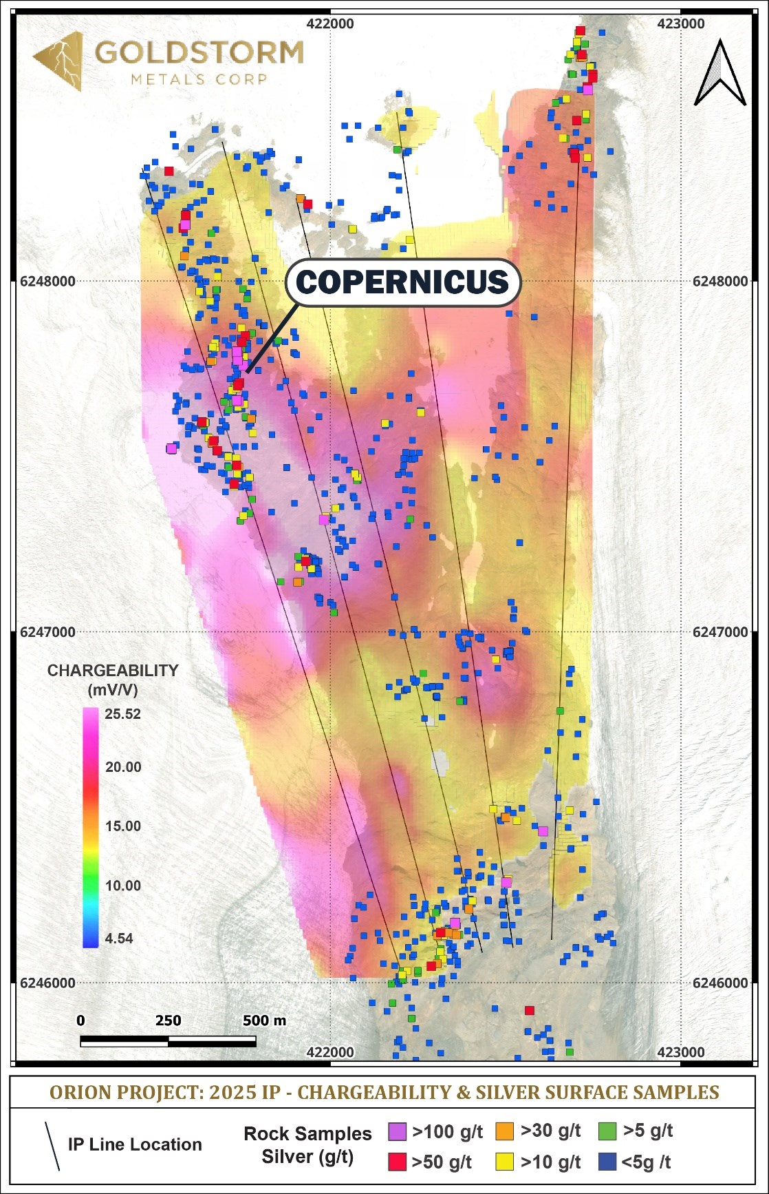 2025 IP Chargeability Map (Silver Samples) - Copernicus Zone at Orion Spine, Crown Property