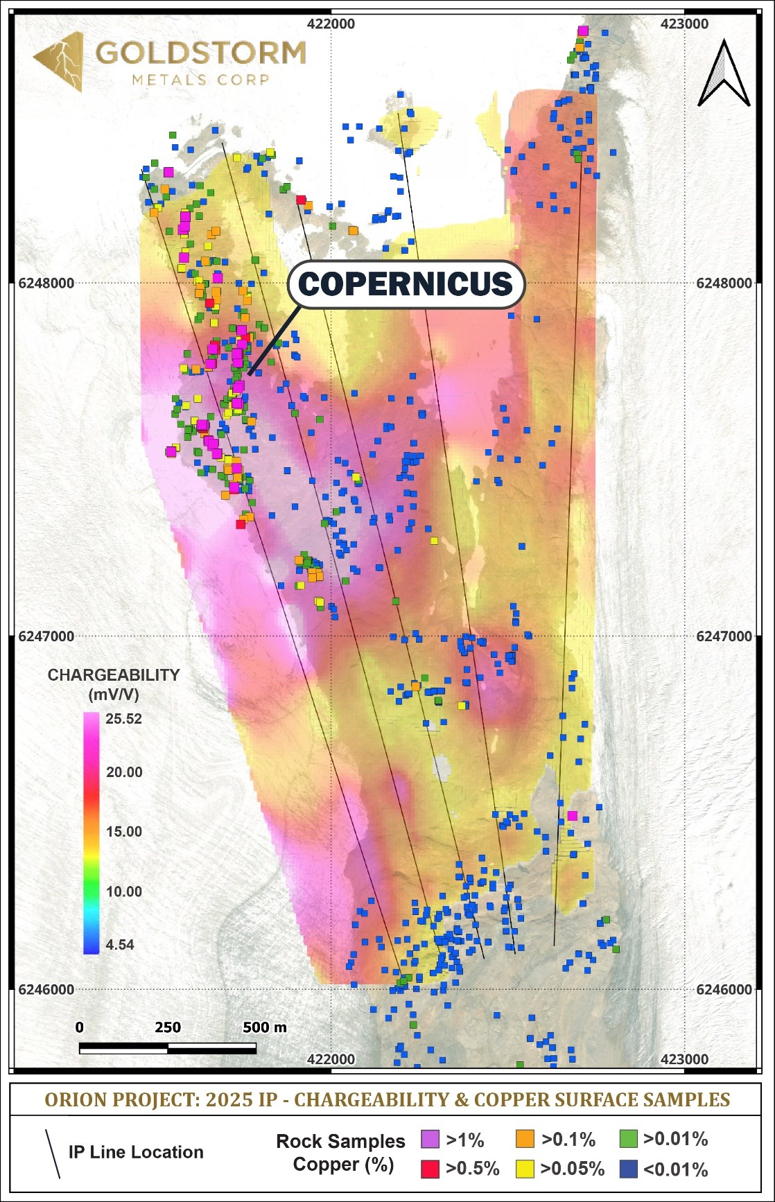 2025 IP Chargeability Map (Copper Samples) - Copernicus Zone at Orion Spine, Crown Property
