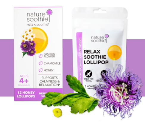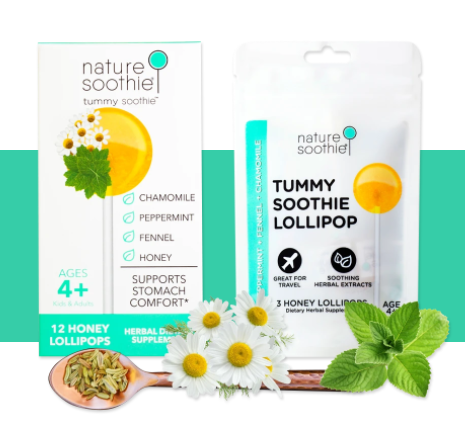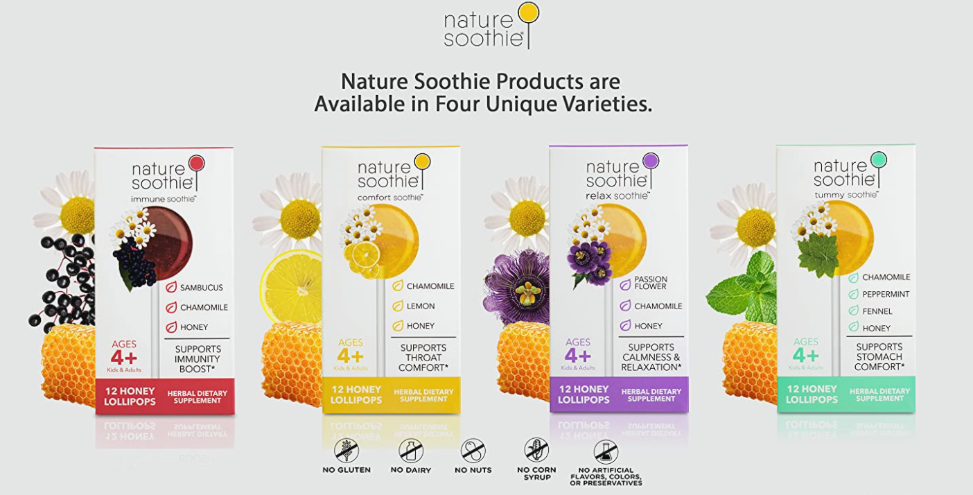 Nature Soothie offers a variety of children’s herbal supplements designed to address specific everyday health needs (Immune, Tummy, Comfort, and Relax). The lollipops are made with