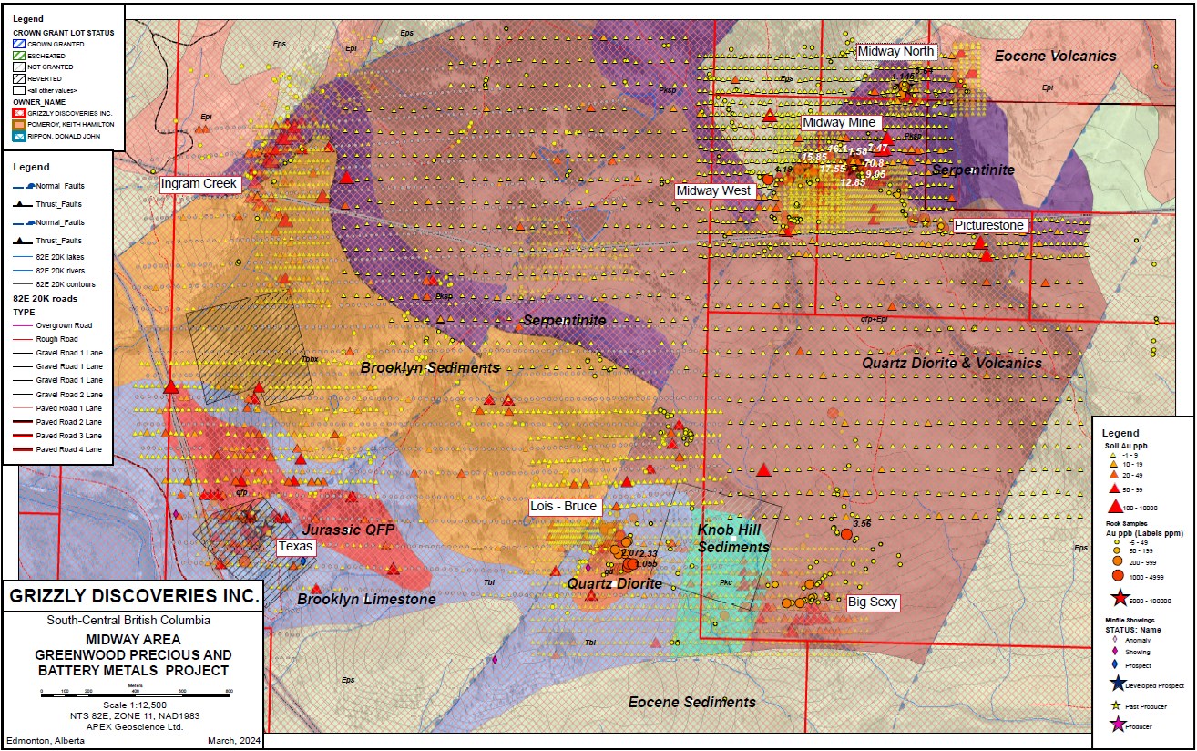 Figure 2. Midway geology and showings with gold in soils and rocks.