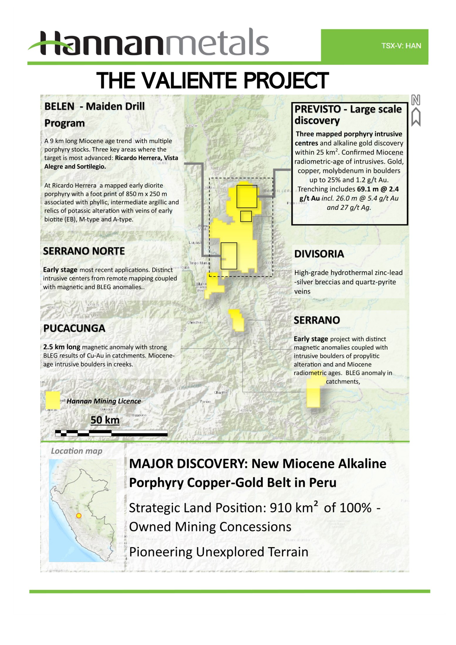 Hannan Metals Limited is an exploration company focused on the identification and delineation of large gold and copper mineralizing systems in new frontiers in Peru. Over the last decade, the team behind Hannan has forged a long and successful record of discovering, financing, and advancing mineral projects in Australia, Europe and South America.