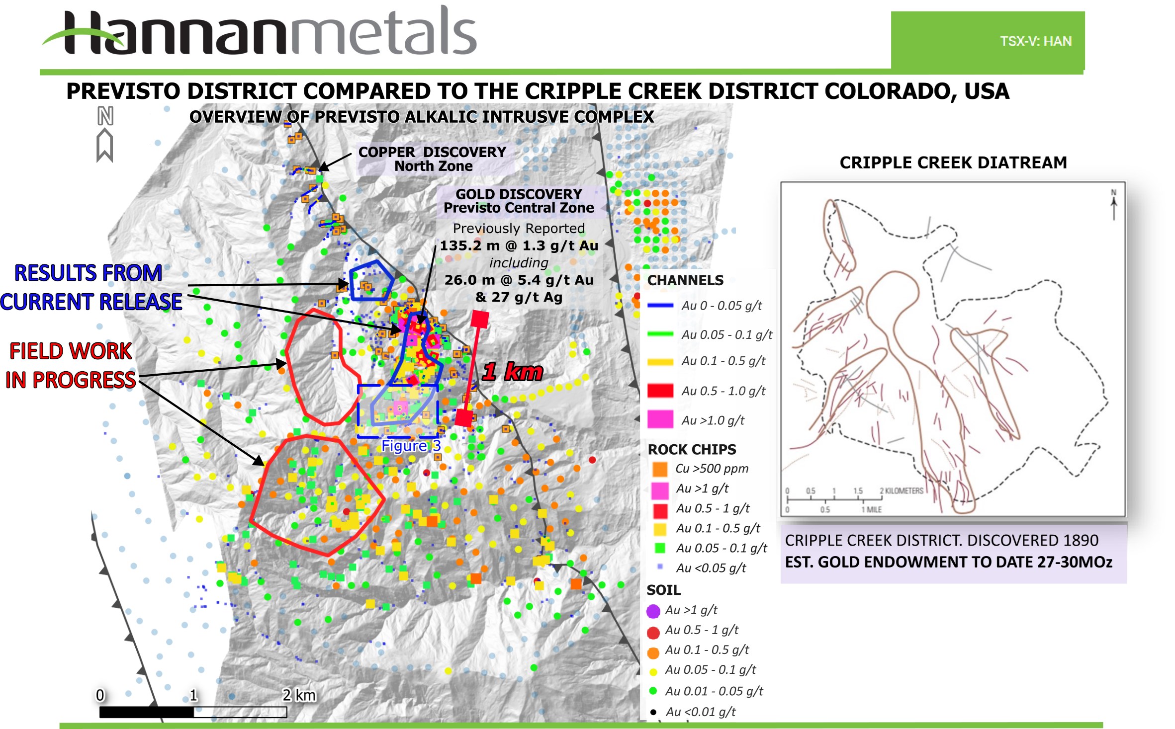 Figure 2: Map showing the vast 5x5 km gold anomaly at Previsto and the location of the current results, in comparison to the Cripple Creek gold district.