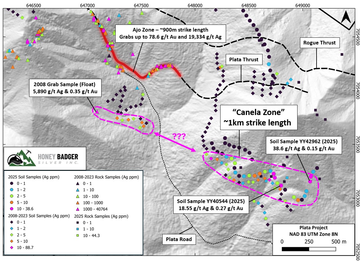 The Company is excited to share that the Canela Zone, a newly identified silver and gold anomaly, has been successfully identified from the first batch of assay results at Plata. The Canela Zone is approximately 1 km in currently identified strike length and is highlighted by soil samples with up to 38.6 g/t silver, 0.27 g/t gold,