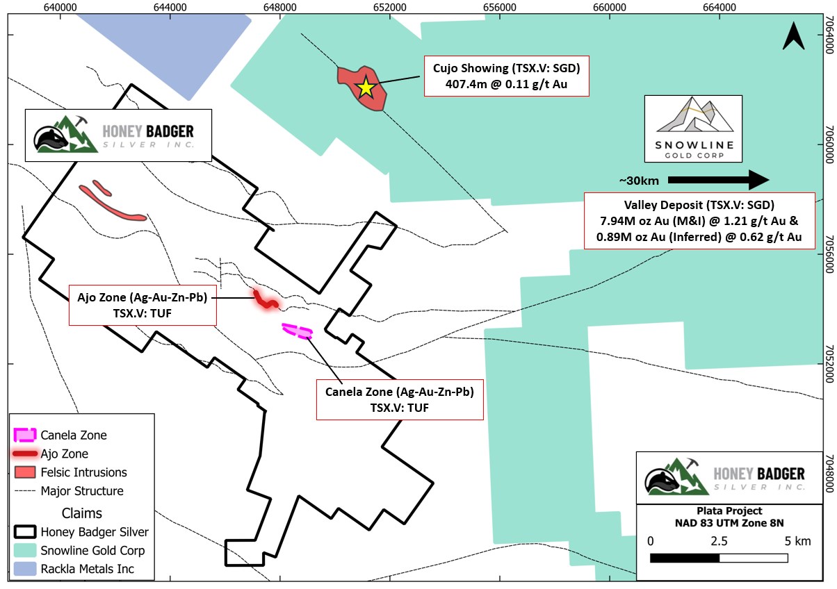 The Company's Executive Chairman, Chad Williams, commented: "The Canela zone represents the first discovery from last summer's exploration work at Plata. Our thesis that Plata has an exceptional mineral endowment has been further supported. Canela is a large mineral zone that shares similar characteristics to the nearby high-grade silver and gold Ajo zone. The currently known size and mineral values of the surface expression of the new Canela zone compares favorably with the early-stage surface expressions of what would become important mineral discoveries elsewhere in the Plata district. In particular, Canela appears to also be east-west trending and contains significant silver and gold values. The recent recognition of significant gold mineralization in the Ajo-Canela area is important since the Plata property is located adjacent to Snowline Gold's (TSXV: SGD) Rogue property which is the site of a major gold discovery."